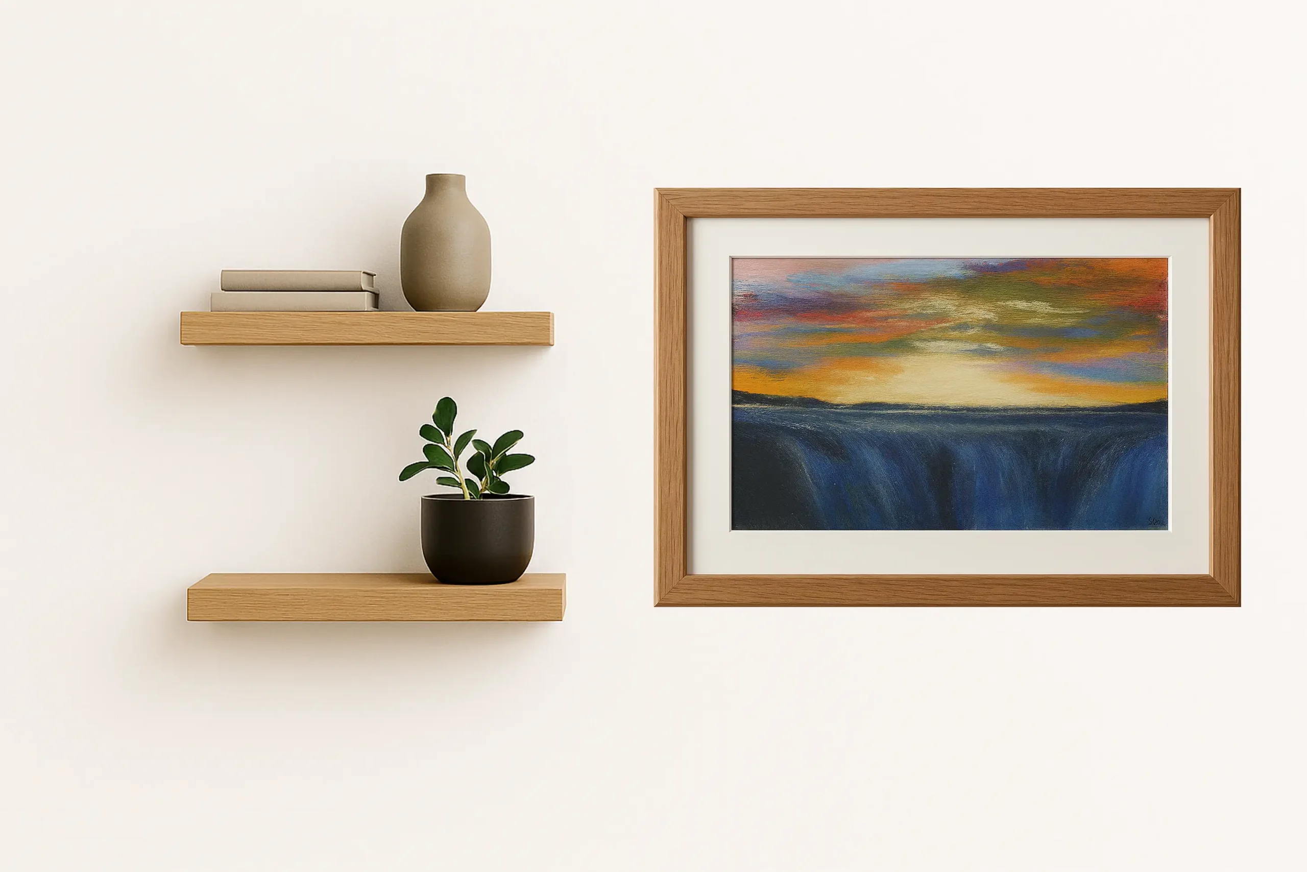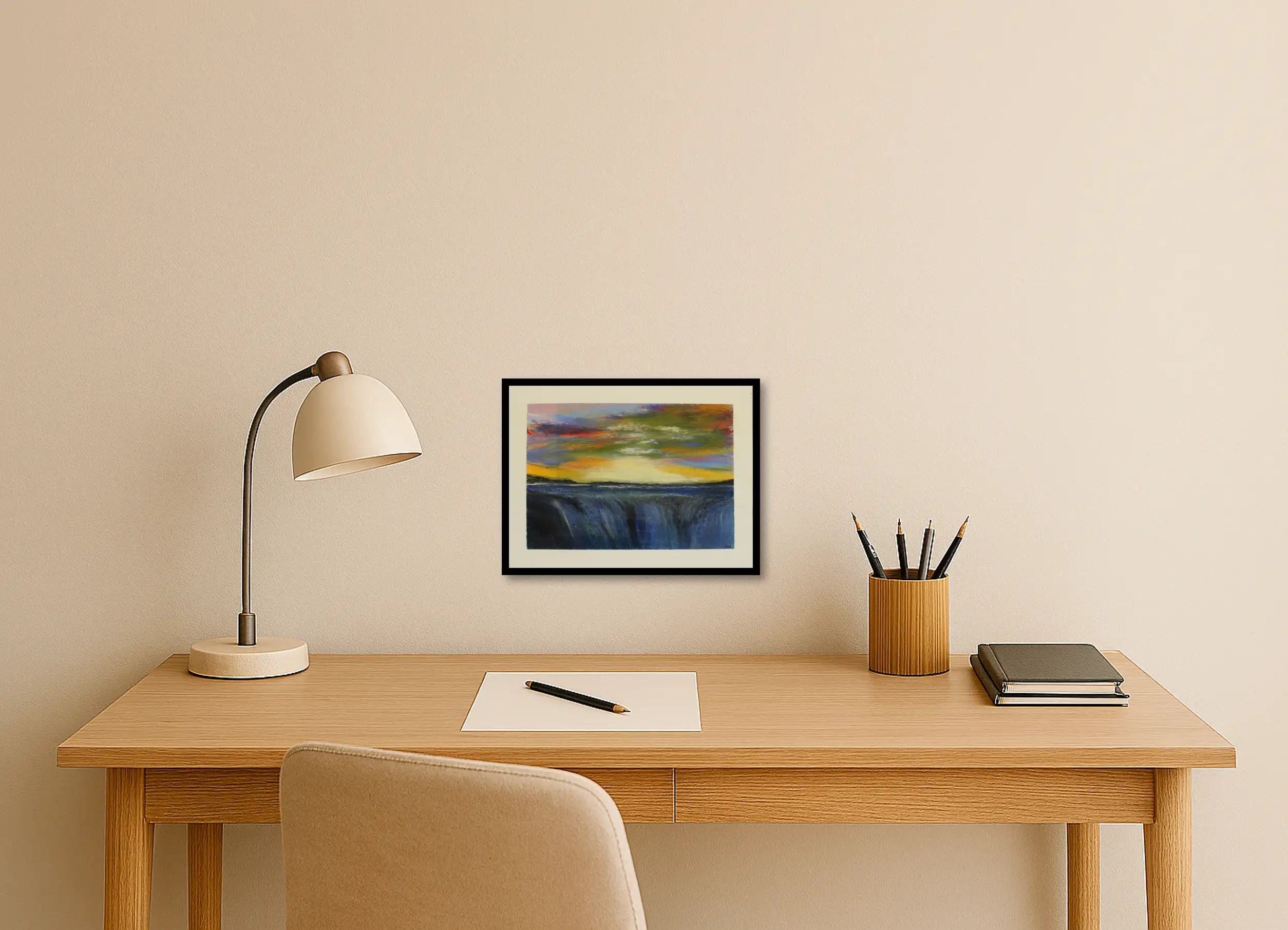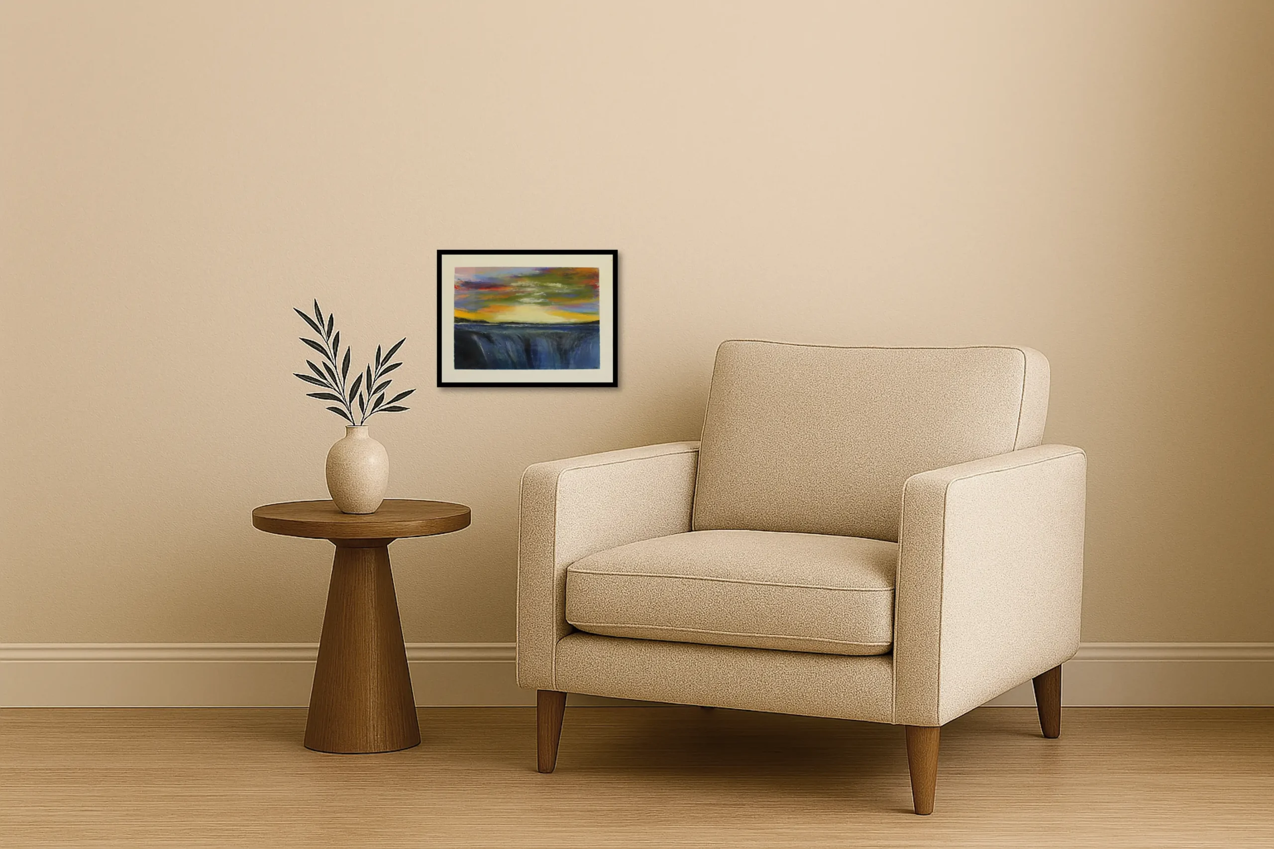The sky opens in a rush of colour, spilling fire and violet dusk across the world. Light gathers at the horizon and tumbles downward, as if the sun itself has chosen to fall into the water below. In this moment, everything is motion—sky in collapse, water in ascent, colour in conversation with itself. The painting holds the breath between day and night, where endings feel like beginnings wearing a brighter coat.